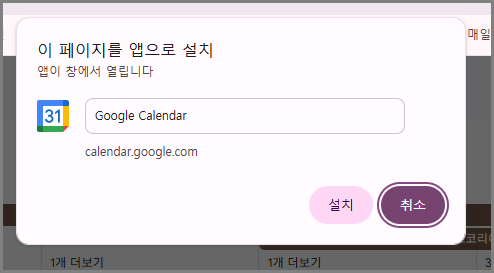 - 3단계: ‘이페이지를 앱으로 설치’라는 창이 생깁니다. 설치를 클릭하면 바탕화면에 구글캘린더가 생깁니다.
